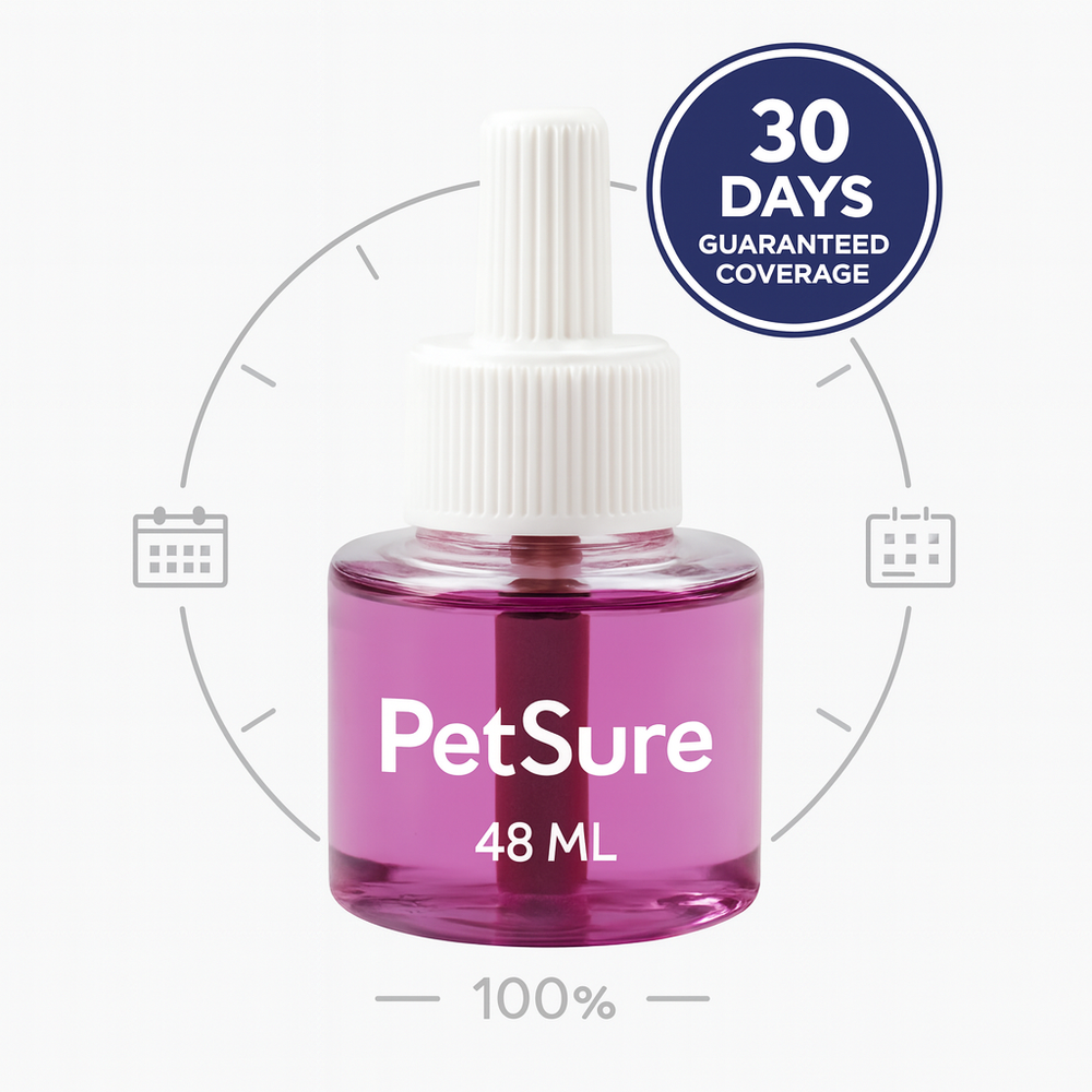 Each 48ml refill provides a full 30 days of continuous coverage for approximately 700 square feet. Unlike competitors that run out early, PetSure's formula maintains consistent dispersion for the entire month. Replace when the bottle is visibly empty